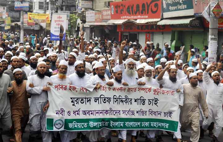 হজ ও তাবলিগ জামাত নিয়ে মন্তব্য করে ধর্মীয় অনুভূতিতে আঘাত হানায় আবদুল লতিফ সিদ্দিকীর শাস্তির দাবিতে বায়তুল মোকাররম এলাকায় বাদ জুমা বিক্ষোভ মিছিল বের করেন সম্মিলিত ইসলামী দলগুলো।